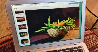 Michael – wir waren inzwischen per Du – kam mit beladenem Auto und baute sein Equipment zusammen: Auf unserem Esstisch, der zum Glück groß genug war, um ein kleines Fotostudio für zwei seitliche Perspektiven und eine Fotosituation direkt von oben einrichten zu können. Zum Essen gab es natürlich dann keinen Platz mehr. Da wir im Dach wohnen und eine sehr große Fensterfläche haben, war das Problem eher von zu viel als von zu wenig Licht. Es wurde mit Stativen und Leintüchern ein großes Zelt über den Esstisch gespannt, das das Sonnenlicht streute und weicher machte.