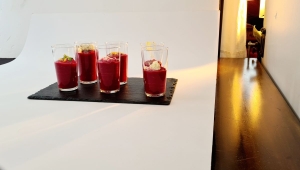 Nun konnte es beginnen. Wir richteten den ersten Salat an, es war der Tomatensalat mit Fisolen. Michael und wir testeten uns gegenseitig. Können die beiden kochen, verstehen sie das Anrichten und Präsentieren? Was wollen die beiden von meinen Fotos, was sollen meine Fotos können? Wie lange braucht Michael, um den Salat abzulichten? Welche Ansprüche stellt er an uns, damit seine Fotos seinen Vorstellungen entsprechen? Wir geben es zu, wir waren unsicher, er ruhig und souverän. Ein paar Tipps von seiner Seite waren hilfreich, und er freute sich über direktes Feedback von unserer Seite. In Kürze entstand eine kreative Arbeitsatmosphäre, die wir alle als bereichernd empfanden. Ulli setzte auf den Tellern viele ihrer optischen Ideen um, die sie aus der Patisserie entlehnte. Johannes konnte mit seinen Erfahrungen als Theaterregisseur auch punkten, wenn es um Fragen der Beleuchtung oder auch um Perspektiven des Gerichtes ging. Manchmal reichte eine Drehung des Tellers um ein paar Grade, damit der Salat besser aussah, oder eine kleine Änderung im Winkel des zusätzlichen Scheinwerfers, der ein warmes Licht auf den Teller sandte. Johannes war oft mit der Anrichtepinzette bewaffnet, um noch Kleinigkeiten auf dem Teller zu modifizieren. Wir hatten Spaß an der gemeinsamen Arbeit. Wir sahen aber auch, dass nicht nur das Salateherstellen in Serie, sondern auch das Fotografieren körperlich anstrengend war. Vor allem die Perspektive gradlinig von oben forderte vom Fotografen große körperliche Disziplin, wenn sich Michael auf der Leiter stehend direkt über das Motiv beugen musste. Das Rund des Tellers durfte dabei nicht verzerrt werden.