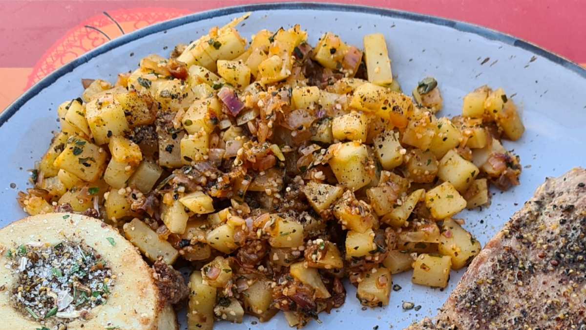 Wir haben den Strunk erst einmal in Olivenöl und etwas Weißwein mit einer Schalotte und Gewürzen – frischen Kräutern, Sesam, Salz, Pfeffer und Knoblauch – als Beilage gegart. Da war der Kohlrabigeschmack am deutlichsten.