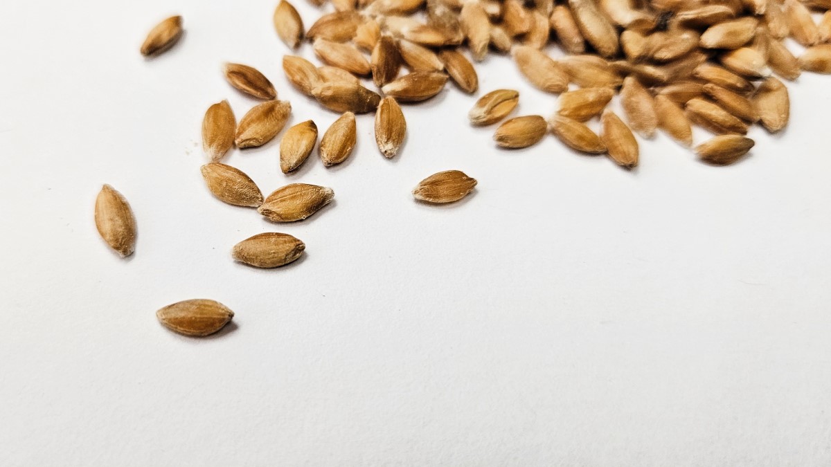 Auf dem Foto sieht man im Vergleich (v.l.n.r.) die Körner von Einkorn, Dinkel, Emmer und Hartweizen.