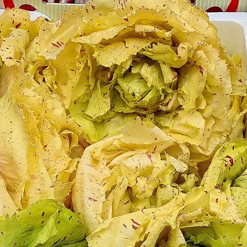 Der Radicchio Variegato di Lusia hat ein ähnliches Aussehen wie der Variegato di Castelfranco: Beige-weiße Blätter mit weinroter Sprenkelung, aber mit einem sehr festen runden Kopf. Die Ernte erfolgt zwischen Ende August und Anfang November, also vor dem beliebteren Variegato di Castelfranco.
