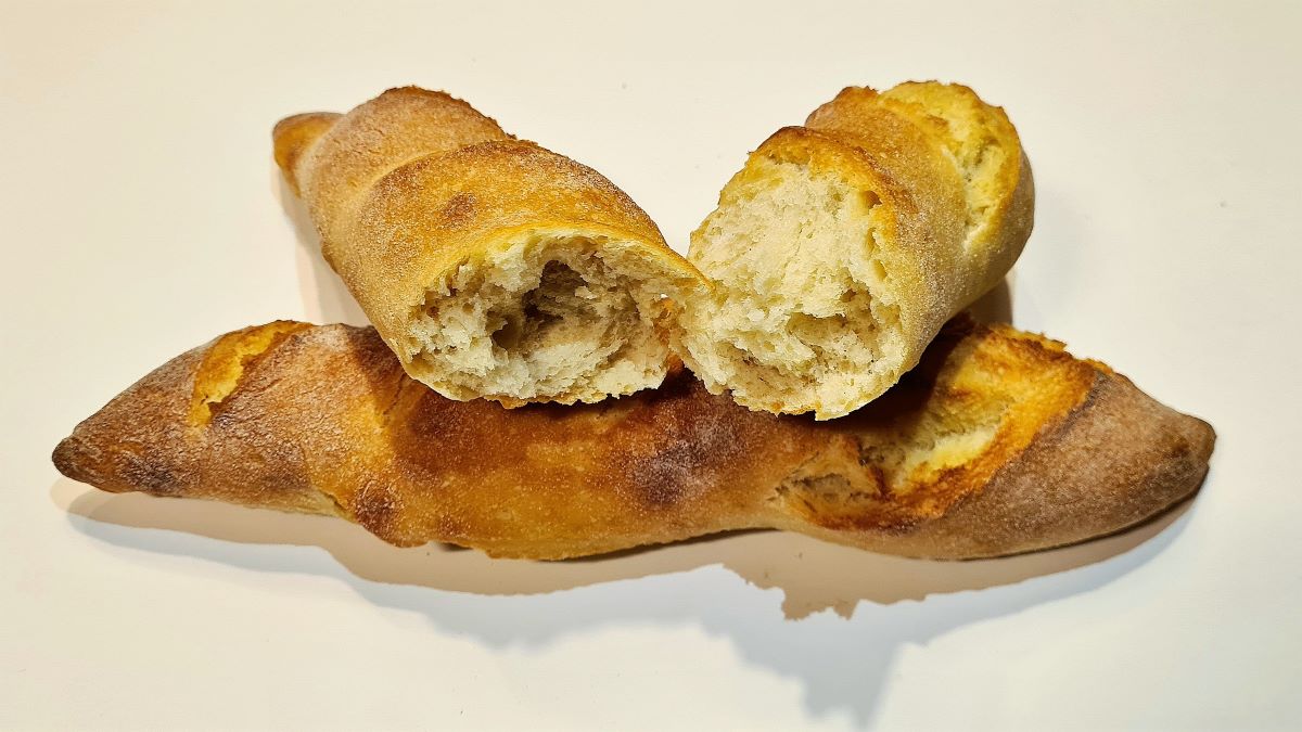 Kamut ist wie schon beim kleinen Kamutbrot erwähnt eigentlich ein Markenname, der sich bei uns für den Khorasan-Weizen eingebürgert hat. Diese alte Weizensorte ist etwas gelblich und sehr aromatisch. Für einen Baguetteteig ist gut geeignet, weil es nahezu dieselben Backeigenschaften wie der gewöhnliche Weizen hat. In Italien gibt es ein Kamutmehl, das sehr hell ist und stark dem Hartweizenmehl Grano Duro di semola rimcinata ähnelt. Mit diesem haben wir dieses Baguette gemacht. Der Vorteig trägt zu einer besseren Dehnbarkeit des Teigs bei, steigert das Aroma und hält die Brote länger frisch. Außerdem kommt dieses Rezept wieder ohne Kneten aus, weil eine lange kalte Gare einen feinen, gut zu verarbeiteten Teig entstehen lässt.