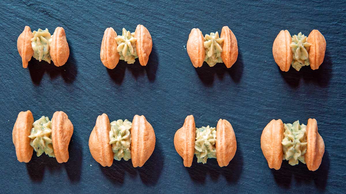 Während des Backvorganges den Roquefort mit der flüssigen Butter mit einer Gabel zerdrücken und mit Salz und Pfeffer abschmecken. In einen Dressiersack mit gezackter Spritztülle füllen. Nun auf der Servierunterlage in ausreichen Abstand voneinander kleine Häufchen spritzen und jeweils 2 Mürbteigkekse links und rechts an das Häufchen andrücken. Frisch servieren oder bis zum Servieren kühl stellen.