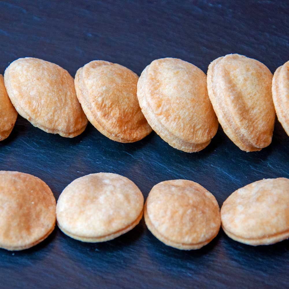 Wagenrader leerLeider blieben aber die Kreise während des Backvorganges keine Scheiben, sondern plusterten sich auf, es entstanden ovale Pölsterchen. Nach dem Abkühlen gekostet schmeckten sie köstlich, nur kann man diese aufgeblasenen Kekse nicht als Scheibe belegen. So dachten wir über eine etwaige Verwendung nach und kamen zu dem Schluss, dass man jeweils 2 Kekse ja auch aufstellen kann, und dazwischen eine Füllung platzieren kann, die alles zusammenhält. So entstanden feine „Roquefort Wagenräder“.
