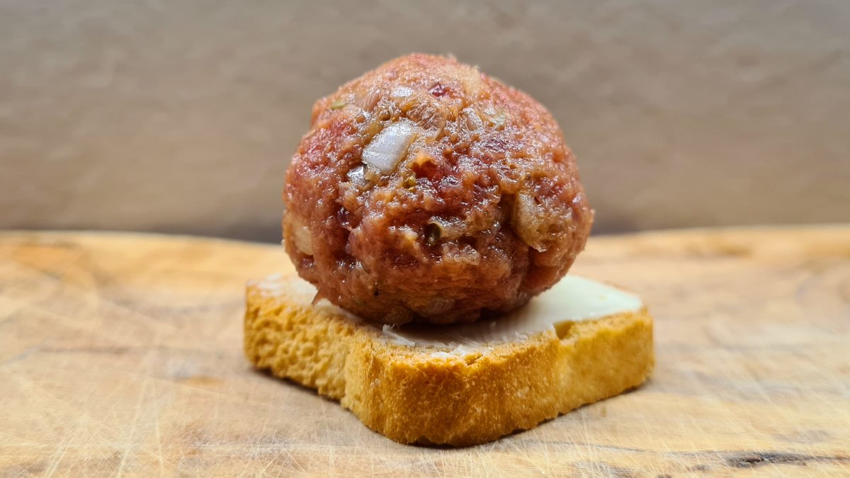 Das ganz frische Fleisch in einer Schüssel zerteilen. Die Zwiebel gemeinsam mit den Kapern und dem Sardellenfilet fein hacken und zum Fleisch geben. Alle Gewürze, das Dotter und den Senf da zugeben und zusammen mit einer Gabel fein vermischen. Das Brot toasten, mit Butter bestreichen und die Rinde abschneiden. Aus einer Scheibe vier Quadrate schneiden. Das Fleisch nochmals abschmecken und anschließend mit feuchten Händen 3 Zentimeter große Kugeln formen. Diese auf die kleinen Toastquadrate legen und auf einer entsprechenden Platte servieren.