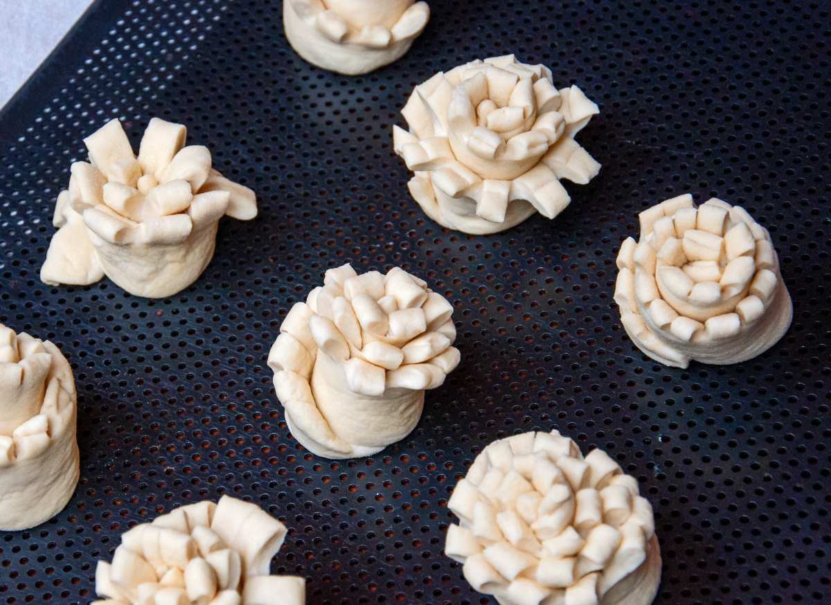 Den Teig auf eine dünn bemehlte Arbeitsfläche geben und in 8 gleich große Portionen à ca. 100 g teilen. Die 8 Teiglinge zylindrisch langformen und in einem Bäckerleinen abgedeckt 5 – 10 Minuten ruhen lassen. Die Teiglinge flach drücken und in lange, ca. 5 cm breite Streifen auf eine Dicke von 0,5 cm ausrollen, seitlich knapp alle Zentimeter ca. 8 mm tief einschneiden, der Länge nach aufrollen und das Ende leicht in die Unterseite drücken. Sollte der Teig etwas trocken sein, mit einem in Wasser getauchten Finger das Ende befeuchten und in die Unterseite drücken. Auf das Backblech stellen und abgedeckt 45 – 60 Minuten ruhen lassen.