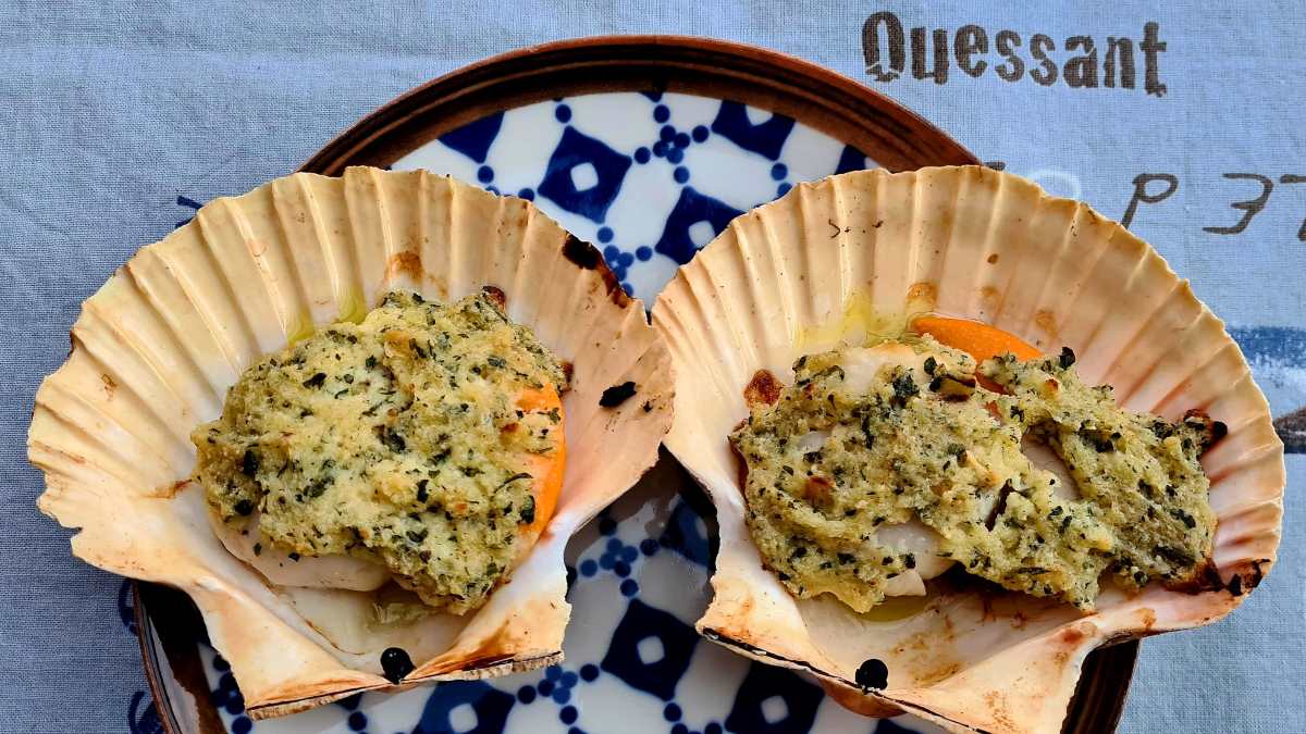 Johannes erinnert sich immer noch an seine ersten Jakobsmuscheln, die er als 18-jähriger in Sète, Südfrankreich, gegessen hat. Sie waren auch gratiniert, aber innen noch leicht glasig und der Geschmack war geprägt von Jod, Salz, Meer, etwas säuerlicher Crème fraîche, Zitrone, Petersilie und ganz wenig Knoblauch. Diesen Aromen war er auf der Spur und hat „seine“ gratinierten Jakobsmuscheln nachempfunden. Die besten Rohstoffe sind in Muggia gut erhältlich, entweder kommen die Muscheln aus Kroatien oder Italien, dann sind sie kleiner, oder vom Atlantik. Alle sind immer in der Schale und mit dem Rogen, auf Französisch Coraille genannt, auf Italienisch wissen wir es nicht, auch die Fischhändlerin unseres Vertrauens hat keine eigene Bezeichnung dafür gefunden.