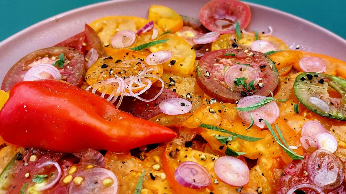 Sabine von der Biogärtnerei Buntgemüse hat auf dem Vorgartenmarkt letzten Samstag eine herrliche Auswahl ihrer Paradeiser mitgebracht. Wir wählten gelbe, orange, grünrote und dunkelrosa Sorten aus, die so saftig und aromatisch waren, wie sie nur im Hochsommer zu bekommen sind. Das heiße Wetter der letzten Woche hat ihnen einen Reifeschub versetzt. Und weil auch die süßen Paprika gerade ihren Höhepunkt haben, bauten wir einen davon ins Carpaccio ein.