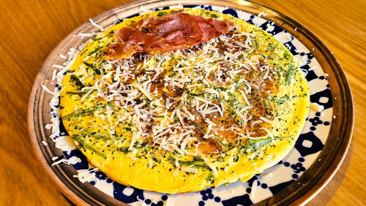 Zum Servieren die Frittata auf einem Teller anrichten, optional eine knusprig gebratene Scheibe Prosciutto darauflegen und großzügig Parmesan darüber hobeln oder grob reiben.
