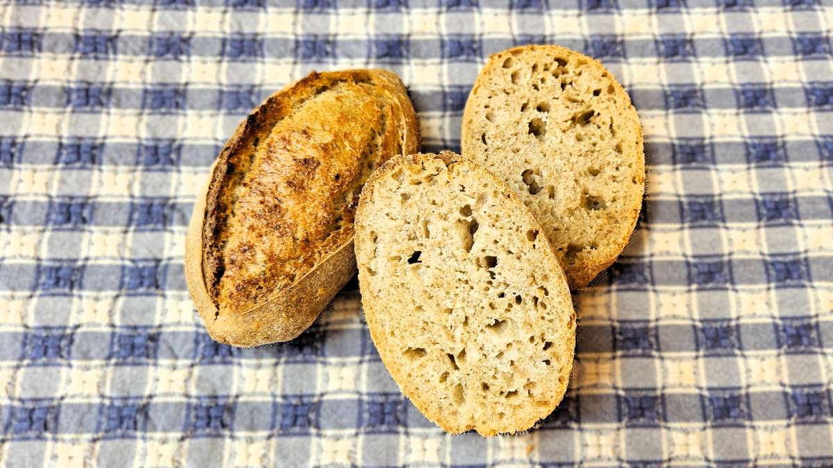 Mit dem Schluss nach unten aufs Blech setzen, einmal längs kräftig einschneiden und mit Wasser besprühen. In dem auf 230°C vorgeheizten Backofen bei Ober/Unterhitze mit kräftigem Schwaden backen. Nach 10 Minuten auf 200°C reduzieren und weitere 10–12 Minuten fertig backen. Auf dem Ofen holen, nochmals mit Wasser besprühen und auskühlen lassen.