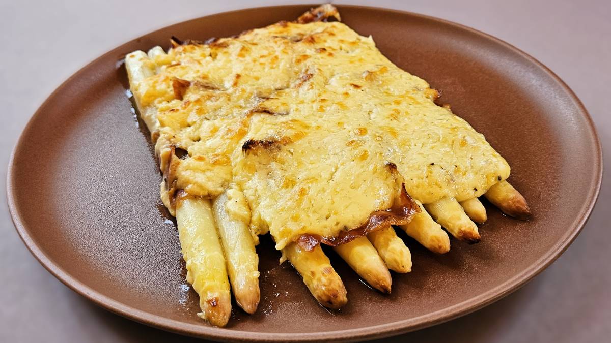 Die Speckscheiben unter dem Backofengrill leicht rösten, abtropfen lassen, mit Küchenpapier abtrocknen und über dem Spargel in der Auflaufform auslegen. Mit der Béchamelsauce bedecken, die Oberfläche mit Butterflocken bestreuen und das Gratin im vorgeheizten Backofen bei 180°C etwa 25 Minuten überbacken bzw. bis die Oberfläche schön goldbraun ist. Auf zwei Tellern anrichten.