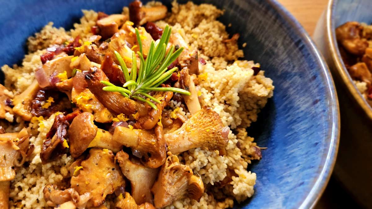 Die Hälfte der Eierschwammerl mit dem Couscous und einem Teil des Orangenschalenabriebs vermengen und auf zwei Schalen verteilen. Die restlichen Eierschwammerln über der Couscousmischung anrichten, mit der restlichen Orangenschale würzen und je eine Rosmarinspitze zur Dekoration darauf stecken.