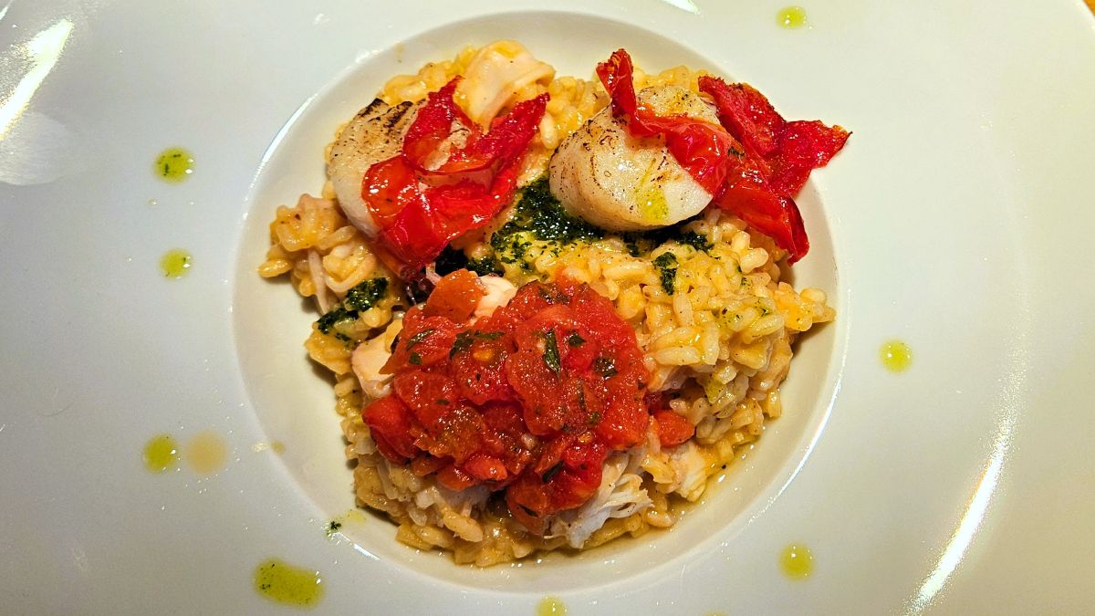 Auch diesmal haben wir das Gericht nur mit dem teuren Acquerello-Reis gekocht. Es ist ein Risotto, das einen gewissen Luxus darstellt, weil es nicht in einem aufgebaut, sondern aus mehreren Komponenten zusammengestellt wird. Da ist erst einmal das Risotto selbst, dazu kommen vorgebratene Calamari, ein Tomatenconcassé, Petersilienöl, frittierte Tomatenschalen und gebratene Jakobsmuscheln. Klingt nach viel Aufwand, ist es auch. Man kann also von einem festlichen Risotto sprechen, das zum Beispiel als Vorspeise zu einem Weihnachtsessen serviert werden kann. Die Farben Grün und Rot würden jedenfalls passen. Und ein klassischer Risottoreis wie Carnaroli würde ein wahrscheinlich ähnlich oder genauso gutes Ergebnis bringen.