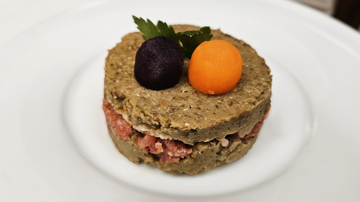 Den Musetto bzw. Cotechino in Scheiben schneiden, ca. 8 mm dick. Jetzt die Millefoglie zusammenstellen: Am besten benützt man einen Speisering mit 8 cm Durchmesser, den man auch zum Ausstechen der Brottaler benützen kann, um die Millefoglie schön anzurichten. Es geht aber auch frei, dann sieht es eben wilder und improvisierter aus, was sogar seinen Reiz haben kann. Zuerst einen Brottaler, dann etwas Linsencreme und eine Scheibe Musetto übereinanderschichten. Wieder einen Taler darauflegen und mit einer Schicht Linsencreme abschließen. Mit dem Speisering-Stempel die Schichten zusammendrücken, wodurch man zusätzlich eine glatte Oberfläche auf der obersten Cremeschicht erhält. Den Ring abziehen. Die Oberfläche mit einem Blatt Petersilie und ein zwei Stücken Karotte verzieren. Dazu eignen sich die gekochten Karotten vom Musetto oder extra gegarte – wir hatten welche vom Vortag, als wir gefüllte Karotten (aus unserem Aperitivo-Buch) machten und die ausgestochenen Kugeln zur Deko verwendeten.
