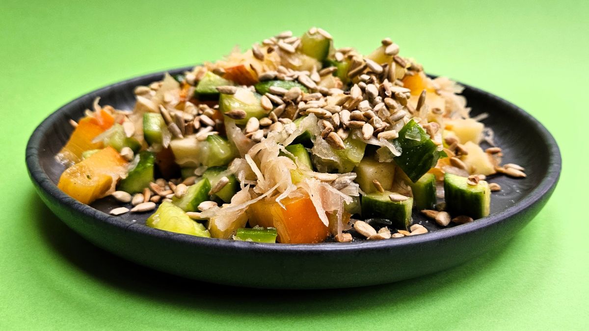 Die Sonnenblumenkerne in einer beschichteten Pfanne rösten, bis sie duften, dann zur Seite stellen. Das Sauerkraut mit dem in Würfel geschnittenen Apfel, der Kaki und Gurke, ebenfalls in Stücke zerkleinert, vermischen. Wir verwenden gern die kernlose Sharon, da sie einfach zu handhaben ist. Anschließend salzen und pfeffern und das Dressing darunter rühren. Zuletzt auf zwei Tellern anrichten und mit den Sonnenblumenkernen bestreuen. Eine leichte Salathauptspeise, wie wir sie gerne mögen.