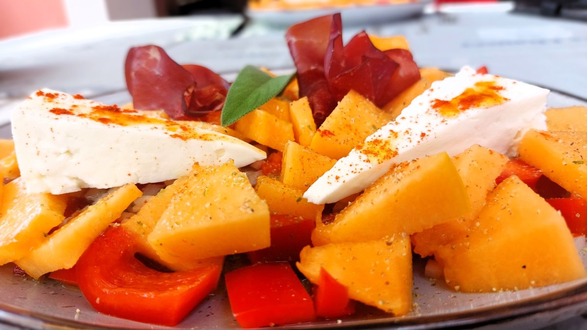Den Paprika entkernen und in mundgerechte Stücke schneiden, ebenso die Melone. Beides mit in Würfel der geschnittenen Zwiebel auf zwei Teller verteilen. Das Dressing zubereiten und mit einem Löffel darüber träufeln. Dann aus den Bresaola-Scheiben Röschen formen und dazwischen stecken. Den Käse in Ecken schneiden, mit Räucherpaprika und etwas Olivenöl bestreuen und dazulegen.