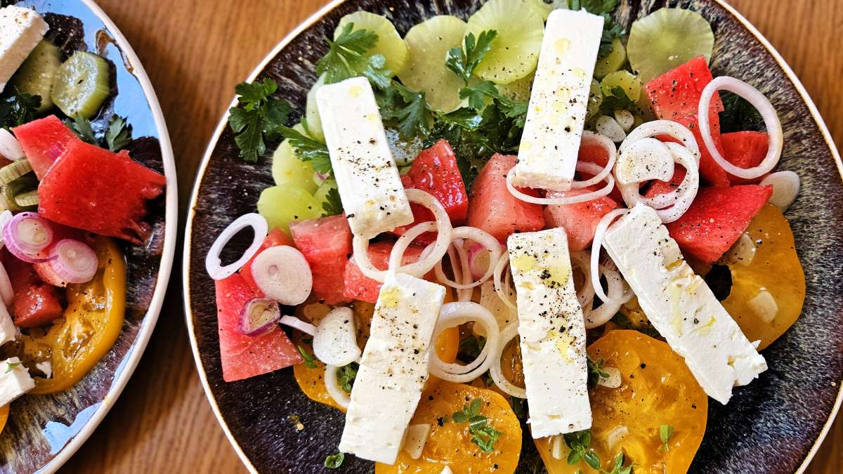 Die chinesische Keule hat wieder Saison! Wir haben bereits den „Bunten Keulensalat“ mit dieser eher seltenen Salatpflanze kreiert und einen Artikel über sie geschrieben. Diesmal kombinierten wir die Farben grün, orange, rot und weiß – erst einmal ein Fest für die Augen, dann für den Gaumen. Denn der leicht bittere, aber sehr saftige Geschmack des Keulenstiels harmoniert bestens mit der Wassermelone und den Fleischtomaten. Dazu passt klassischer Feta. Kräuter und Jungzwiebel runden den erfrischenden Geschmack ab.