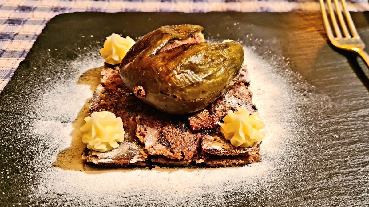 So haben wir das Kletzenbrot am nächsten Tag fein aufgeschnitten und mit der Pralinenfüllung geschichtet, also ein Millefeuille gemacht. Obenauf eine gebratene lauwarme Feige gesetzt, und unsere Gäste und wir waren von diesem improvisierten Dessert sehr angetan.