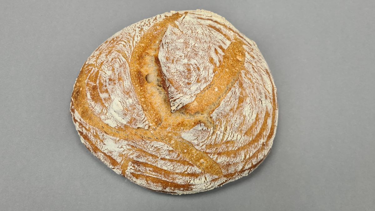 Den Backofen auf 230°C Ober-/Unterhitze vorheizen. Den Teigling sanft aus dem Gärkörbchen stürzen, mit einem Muster einschneiden und in den Ofen mit Schwaden einschießen. Die Temperatur nach 12 Minuten auf 210°C reduzieren und weitere 28 Minuten backen.