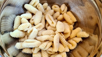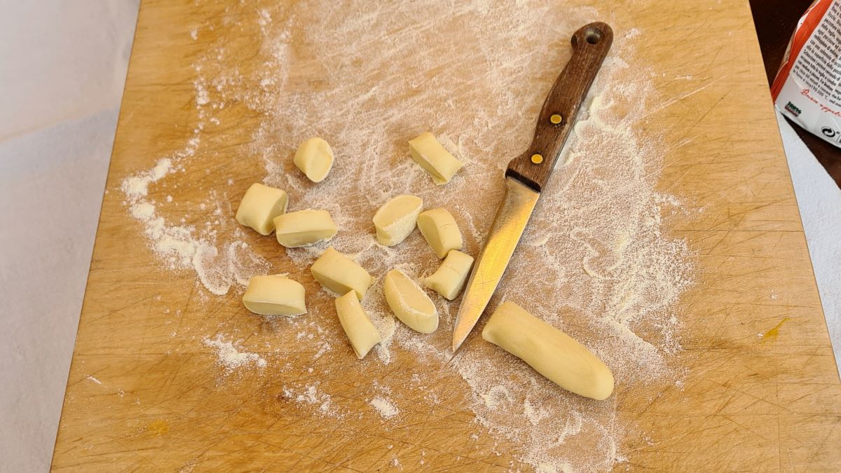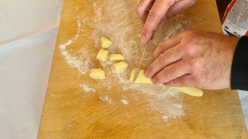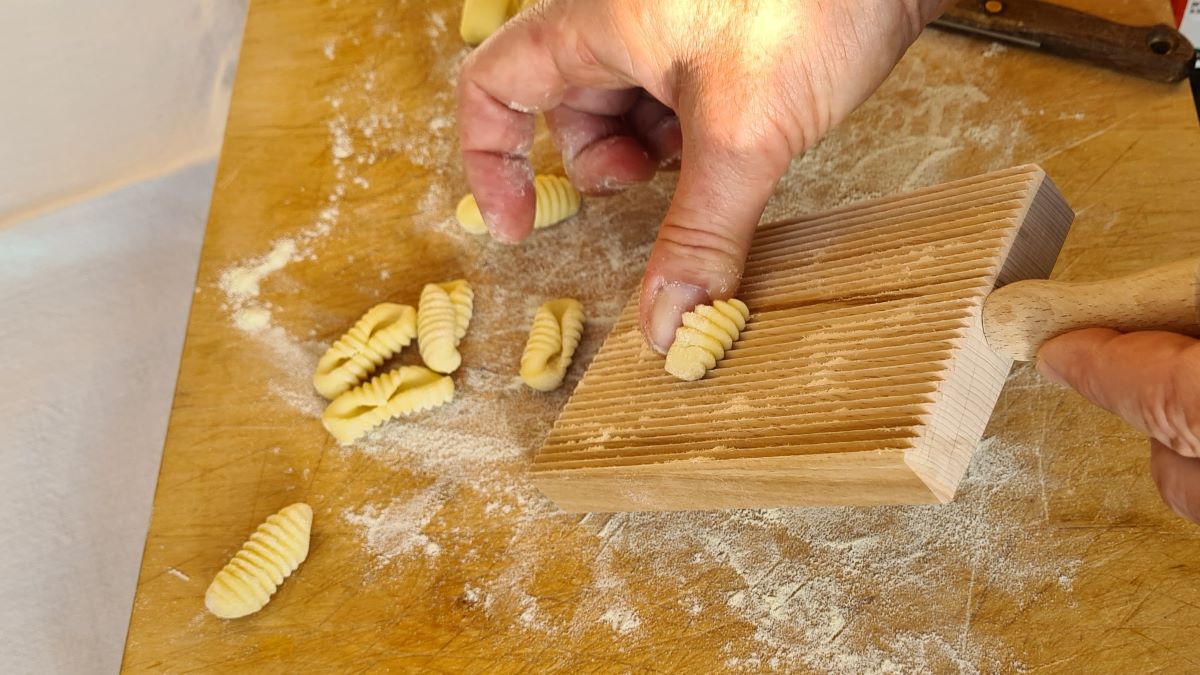 Den Teig auf einem leicht bemehlten Brett portionsweise zu einer ca. fingerdicken Rolle formen. Davon 2 cm dicke Stücke herunterschneiden, diese quer nehmen und mit Daumendruck über das Pastabrett oder die Rigagnocchi rollen, sodass mittig eine Vertiefung entsteht. Mit der Riga-Gnocchi entstehen zusätzlich noch die Rillen.