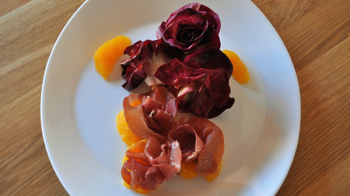 Die wunderbare Rosa di Gorizia spielt immer die Hauptrolle, wenn sie in einer Vorspeise auftaucht. Dieses Rezept ist farblich sehr ansprechend und geschmacklich außergewöhnlich. Das Süß der Orangen verbindet sich hervorragend mit dem zart bitteren Geschmack der Rosen. Luftgetrockneter Rinderschinken bringt noch eine feine Geschmacksnuance ein.