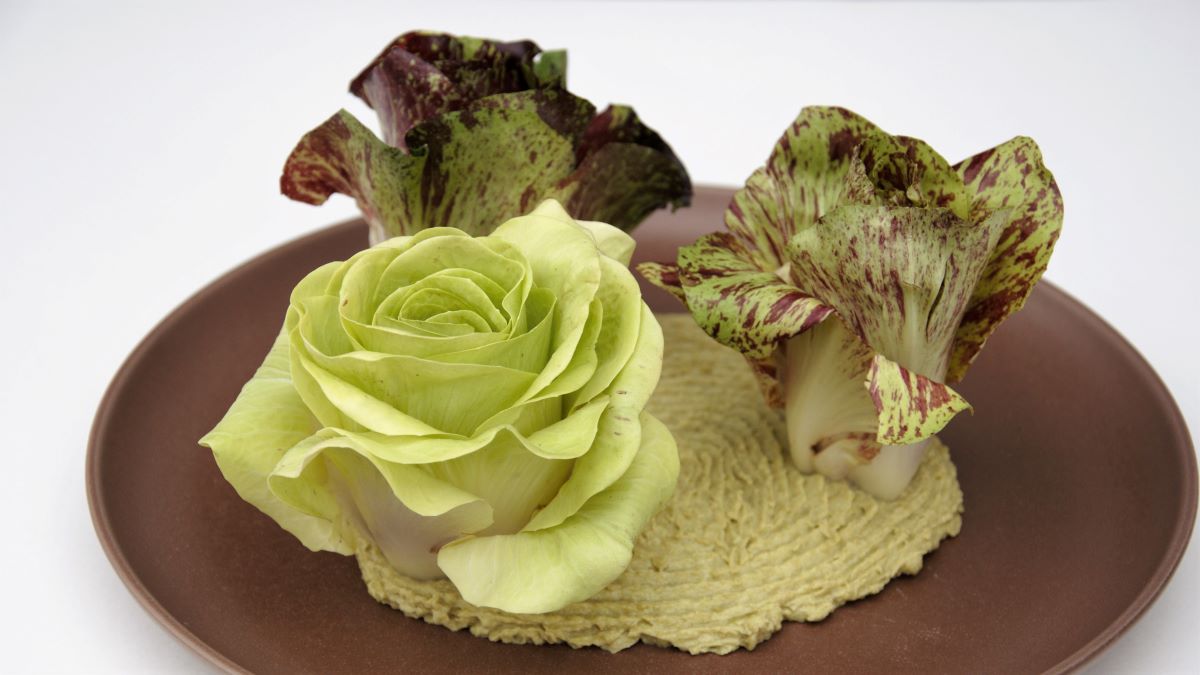 Das Püree auf zwei großen flachen Tellern als Kreis gleichmäßig verteilen und mit einer gezackten Teigkarte (Kammschaber) ein Muster streichen. Die Rosen eventuell am Ansatz gerade abschneiden, damit sie stehen, und im Püree aufstellen.