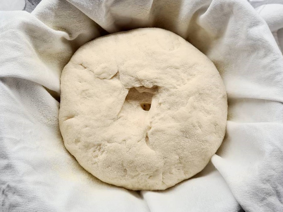 Den Teig auf einer bemehlten Arbeitsfläche rundformen und mit Schluss nach oben 1 Stunde bei Zimmertemperatur in einem bemehlten Gärkörbchen gehen lassen. Wir haben keine so kleinen Gärkörbchen, deshalb haben wir die Stückgare in einer passenden mit grobem Baumwolltuch ausgeschlagenen und bemehlten Schüssel geschehen lassen.