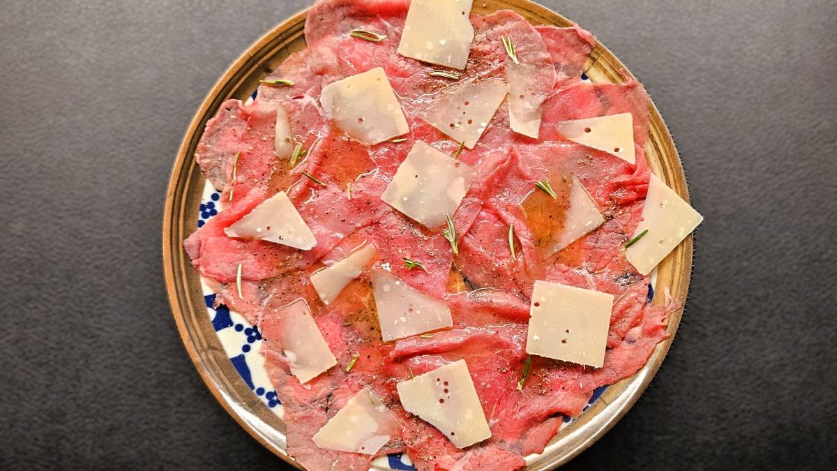 In Muggia werden wir von Giovannis Macelleria immer mit bester Fleischqualität versorgt. Der italienische Fleischhauer weiß, woher das Fleisch stammt und wie die Tiere gehalten werden. Er kauft von kleinen Betrieben, die sorgsam mit ihrem Vieh umgehen. Deshalb haben wir Vertrauen zu ihm, das nie enttäuscht wurde. Diesmal wollten wir ein Rindscarpaccio mit bester Fleischqualität machen.