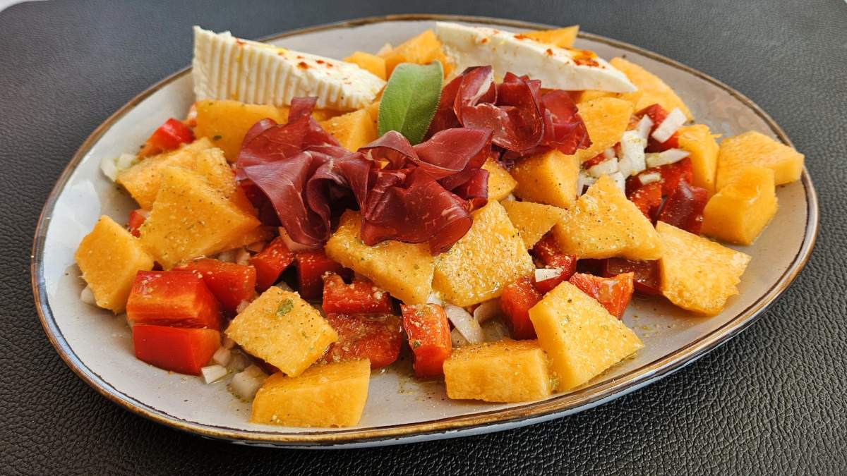 Wir sind wieder in Muggia, in unserer zweiten Heimat Italien. Der Wochenmarkt bietet bereits herrlich reifes Gemüse und Obst aus Sizilien. So kauften wir heute rote Paprika, (ein Stück hat ca. 400 g!) und eine Zuckermelone; roten Zwiebel aus Tropea hatten wir noch vorrätig. Aus diesen drei Grundzutaten entstand ein prächtiger Salat, wir wünschen uns, dass Sie diesen Duft erleben könnten!
