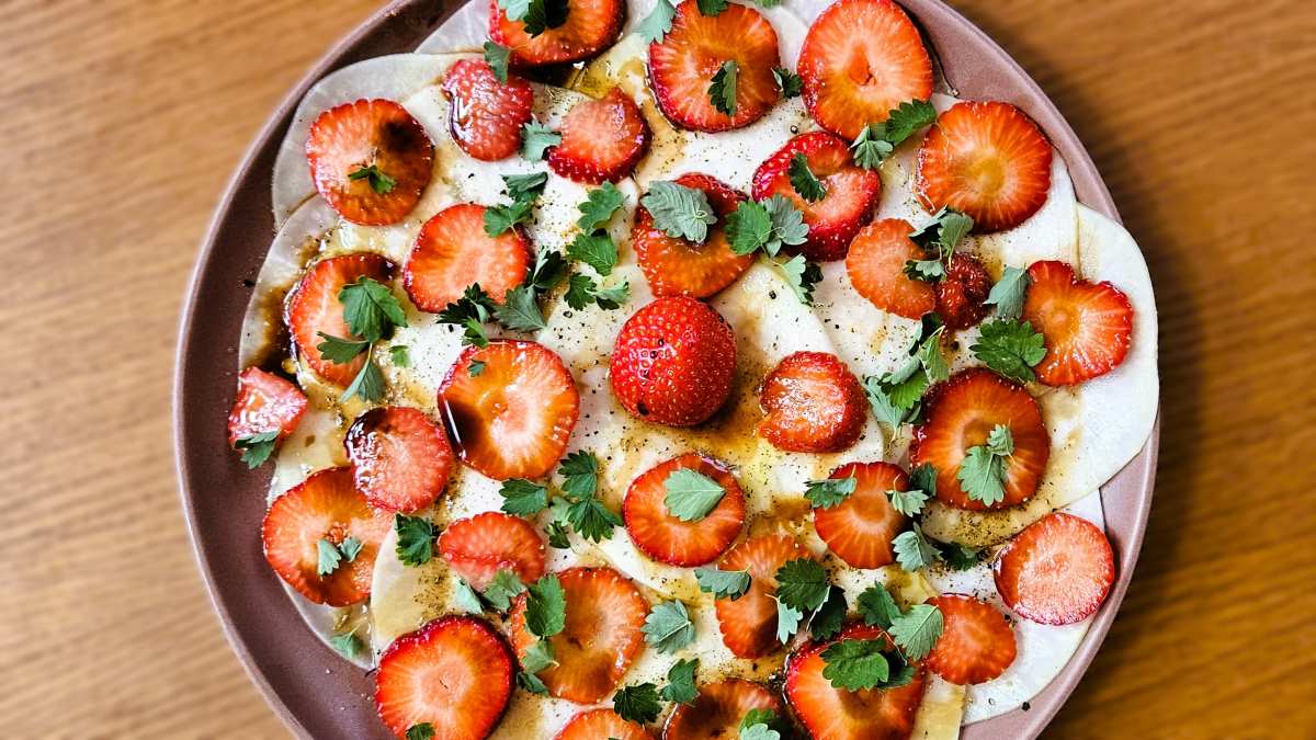 Erdbeeren haben noch Hochsaison, und die frischen Kohlrabis vom Feld sind auf dem Markt erhältlich – da wollen wir unser Lieblingsrezept von der Kohlrübe neu kombinieren: das Carpaccio. Wenn wir diese Knollen frisch anschneiden, tropft der Saft heraus, und uns läuft das Wasser im Mund zusammen. Noch ist die Gefahr gering, dass sie holzig sind, also nützen wir die aktuellen Früchte!
