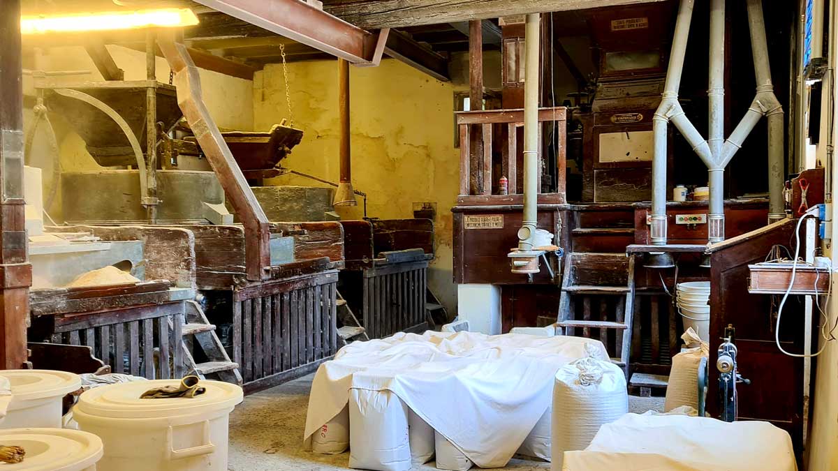 Die Adresse Via Molini ließ darauf schließen, dass es früher mehr Mühlen an diesem Abschnitt des Flusses Stella gab. Es gab vier Mühlen neben einander, klärte uns später Signor Umberto Zoratto, der Vater von Christian, auf, ihre Mühle sei die letzte. Sie ist seit dem frühen 15. Jahrhundert dokumentiert – „noch vor der Entdeckung Amerikas!“ – und seit 1800 im Besitz der Familie Zoratto. Sie haben sich entschieden, keine großen Modernisierungen durchzuführen, sondern weiter mit dem Mühlensystem zu arbeiten, das eine österreichisch-ungarische Firma im Jahr 1850 geliefert und installiert hatte. Es ist eine Steinmühle, die von Wasser angetrieben wird, und langsam, dadurch ohne Wärmeentwicklung, ganz schonend das Korn vermahlt. Maximal 100 kg pro Stunde werden verarbeitet, und so bleiben Mineralstoffe und Keime der Zerealien im Mehl erhalten. Das Getreide stammt von kleineren landwirtschaftlichen Biobetrieben aus dem Friaul und dem nahen Veneto, der Schwerpunkt liegt auf alten Weizen- und Dinkelsorten, die zu Vollkornmehl oder semi-integrales Mehl verarbeitet werden. Letzteres ist heller als Vollkorn, mit deutlichem Schalenanteil und hohem Mineralgehalt, vergleichbar vielleicht mit einem Ruchmehl. Es eignet sich exzellent zum Brotbacken. Auch ein herrliches Polentamehl wird hier erzeugt.