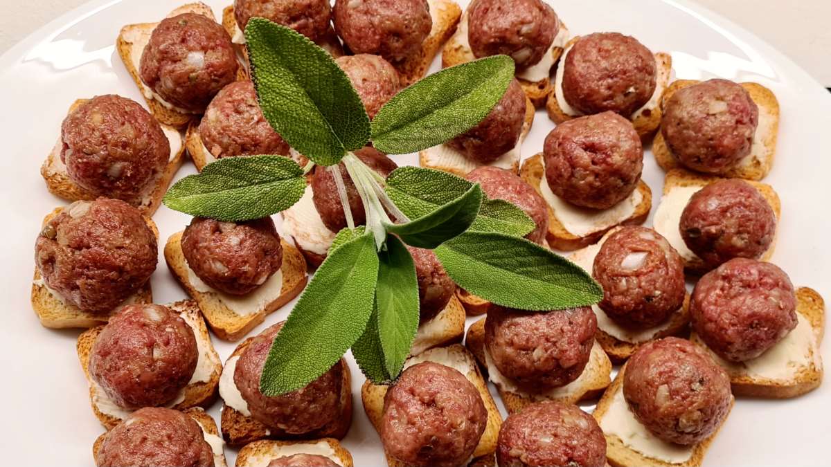 Als Deko kann man auf jede Kugel z.B. ein Petersilblättchen stecken oder auch winzig kleine Gurkerln auffächern, da sind der Fantasie keine Grenzen gesetzt. Wir dekorierten großzügig das Tablett mit einem Salbeistamm.