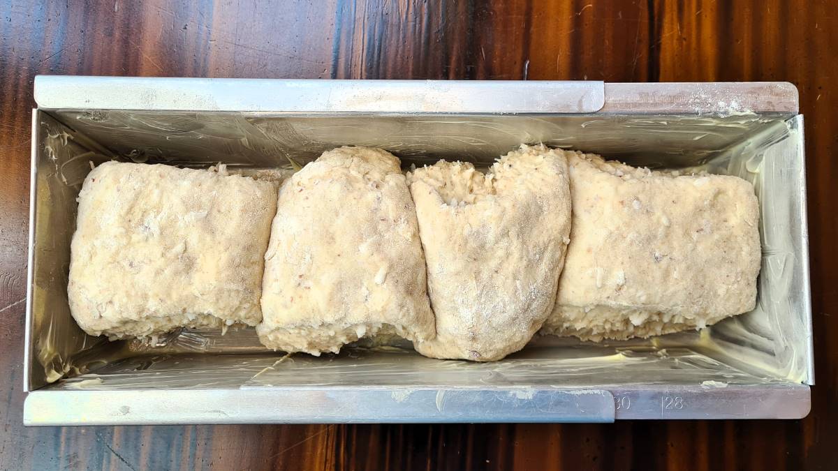 Nach der Reifezeit den Teig straff zu einem Zylinder formen, Schluss unten. Mit der Teigkarte in 4 gleich große Stücke teilen und diese um 90 Grad versetzt in die gebutterte Form legen, so dass die Schnittkanten am langen Rand der Form anliegen.