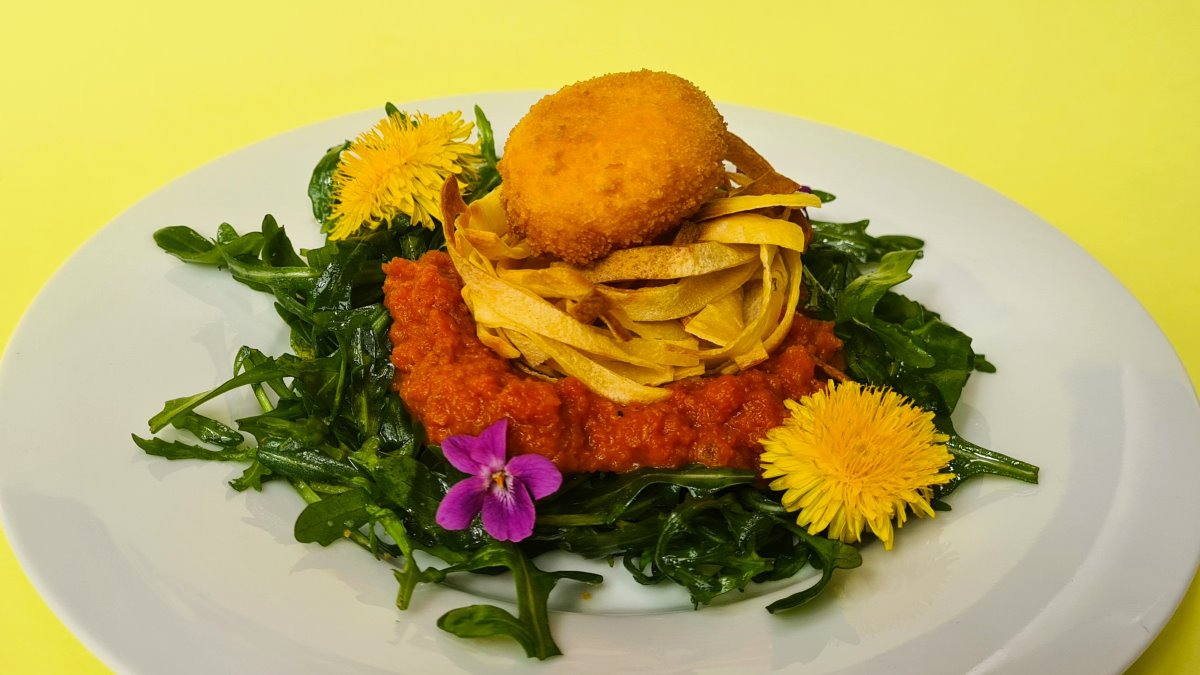 Den Rucola, oder alternative Salate mit Balsamicoessig und Walnussöl vermischen und mit Salz und Pfeffer würzen. Auf den Tellern anrichten. Zwei bis drei Esslöffel von der ausgekühlten Tomatensauce geben und darauf das Frittatennest setzen. Schon jetzt können die Teller mit frühlingshaften Blüten wie Gänseblümchen, Veilchen oder Löwenzahnblüten dekoriert werden.