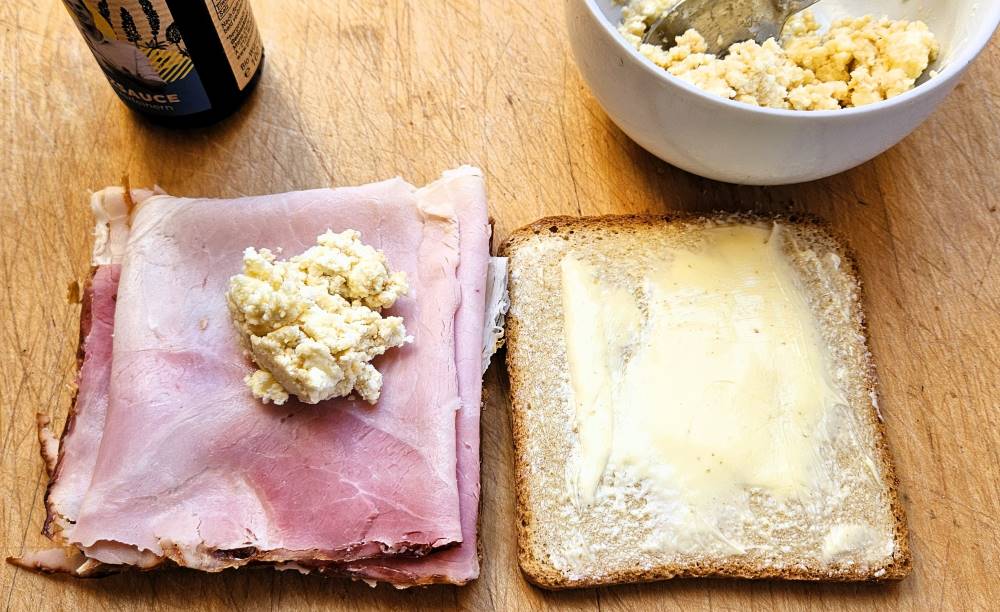 Je eine Seite der Toastscheiben mit Butter bestreichen, auf die erste mit der Butterseite oben den Schinken legen, dabei darauf achten, dass er bündig mit dem Toastbrot aufliegt, also entweder die überschüssigen Ränder abschneiden und auf dem Toast verteilen oder einschlagen. Darauf dünn die Käsecreme auftragen. Das alles wiederholen und mit der zweiten Toastscheibe mit der Butterseite nach unten abschließen. Auf die Oberfläche des Stapels nun die restliche Käsecreme gleichmäßig aufbringen.