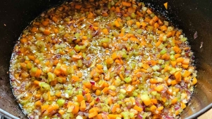 Nebenbei kann man das Gemüse – Sellerie, Karotten, Zwiebeln – für das Soffritto klein schneiden (Brunoise). Wenn man mit dem Fleisch fertig und der Topf leer ist, in diesen etwa halbfingerhoch Olivenöl eingießen und erhitzen. Dann das kleingeschnittene Gemüse dazugeben, brutzeln lassen und bei kleinerer Hitze frittieren. Zuerst entweicht das im Gemüse enthaltene Wasser, das dauert vielleicht 10 bis 15 Minuten, dann fängt das eigentliche Frittieren an. Das Gemüse soll schön weich und etwas gebräunt werden, dabei immer wieder umrühren, anbrennen soll nichts.