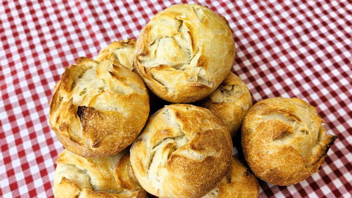 Vor dem Einschießen die Teiglinge mit Wasser besprühen. Bei 205° C mit kräftigem Schwaden 20 bis 22 Minuten auf Sicht knusprig backen. Aus dem Ofen nehmen und nochmals mit Wasser besprühen.