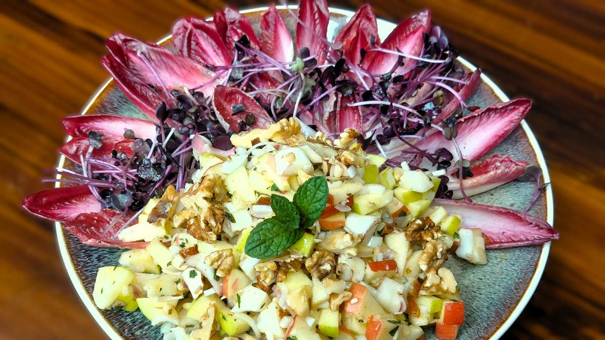Der wissenschaftlich fundierte Ratschlag, mindestens dreißig verschiedene Pflanzen pro Woche zu essen, um die Darmbakterien zu stärken, hat uns sehr gefallen und angespornt, unsere Salate noch vielfältiger zu gestalten. Ein etwas säuerlicher Apfelessig aus unserem Sortiment brauchte einen süßen Kontrapart, so entstand der bunte Teller mit Chicorée, Äpfel, Nüssen, Tropea-Zwiebel und Kräutern.