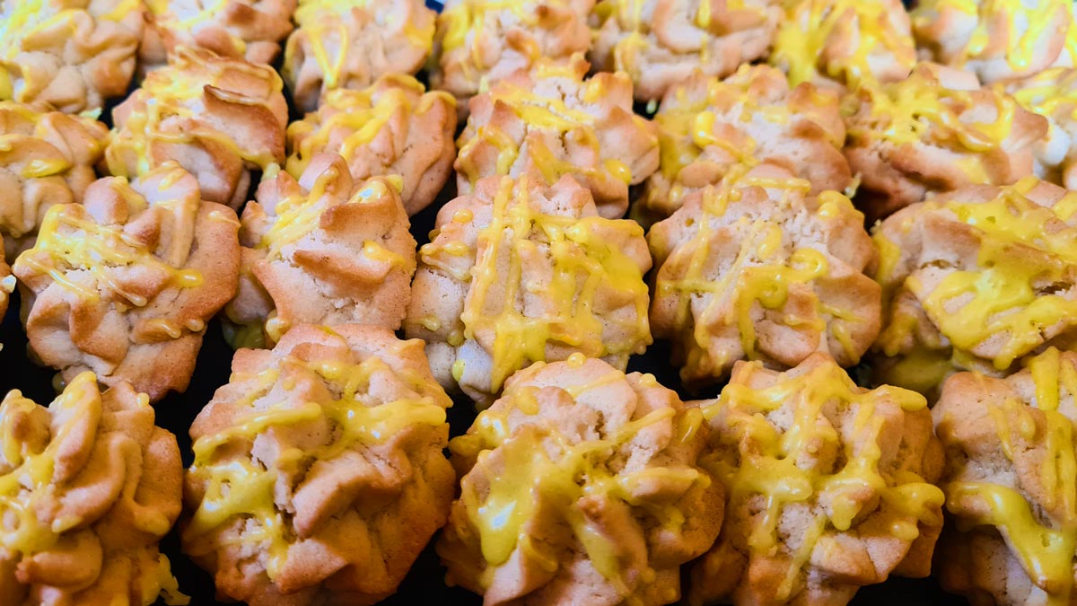 Für die Glasur den Bergamottensaft mit dem Staubzucker zu einer dickflüssigen Glasur verrühren, eventuell mit gelber Lebensmittelfarbe färben und mithilfe eines kleinen Papierstanitzels auf den gebackenen Keksen verteilen.
