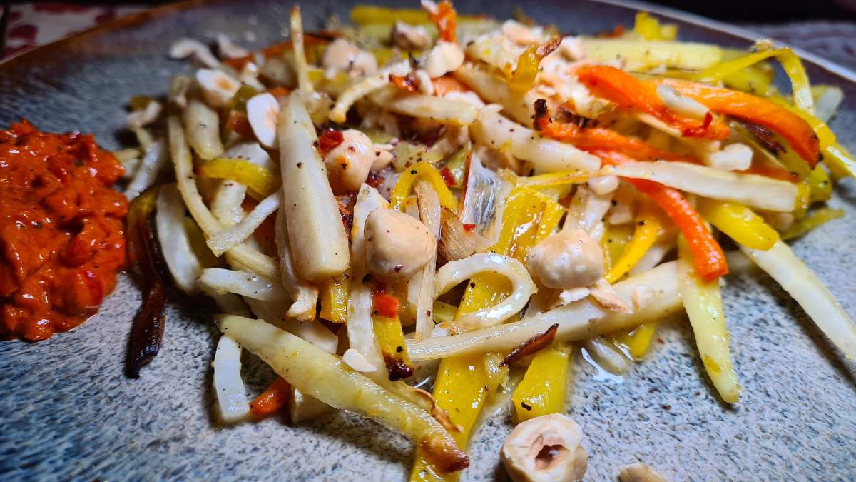 Währenddessen das Dressing mit allen Zutaten aufschlagen und die grob gehackten Haselnüsse in einer trockenen beschichteten Pfanne rösten. Das gegarte Gemüse aus dem Ofen nehmen, auf zwei Tellern anrichten und mit dem Dressing beträufeln. Zum Schluss mit den Haselnüssen bestreuen und warm servieren. Wir haben noch einen Klacks scharfen Ajvar dazu gegeben.