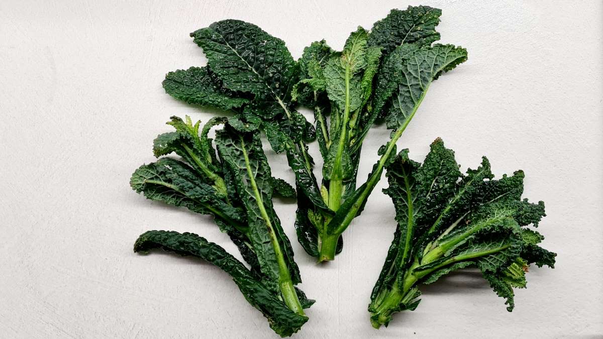 Den gewaschenen Schwarzkohl von den Stielen und den (wenigen) harten Blattadern trennen. Diese Abschnitte für die Suppe verwenden. Dafür entweder eine halbe große Zwiebel oder eine kleine halbierte Zwiebel mit Schale in einem Topf mit 3 EL Öl anbraten, Schnittfläche auf dem Topfboden. Eine halbierte Knoblauchzehe, auch mit Schale dazugeben, anrösten, dann die grob zerkleinerten Kohlabschnitte mitrösten, mit Salz würzen und mit der Gemüsebrühe aufgießen. Rund eine halbe Stunde köcheln lassen und dann durch ein Sieb abseihen.