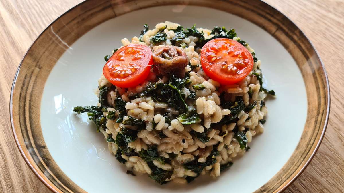 In einem Topf den Reis trocken antoasten, dann die Butter hinzugeben und schmelzen lassen. Die restlichen Zwiebeln und die feingehackte Knoblauchzehe gemeinsam darin anschwitzen. Die gehackten Sardellenfilets einrühren, die sich recht schnell auflösen. Dann mit dem restlichen Weißwein ablöschen, und wenn die Flüssigkeit eingezogen ist, nach und nach die heiße Suppe angießen, bis der Reis bissfest gegart ist. Sofort den Kohl aus der Pfanne einrühren, kurz danach von der Hitze nehmen, 2 EL geriebenen Parmesan, die geriebene Zitronenschale und das Zitronenolivenöl hinein rühren. Durchziehen lassen. Abschmecken mit Salz.