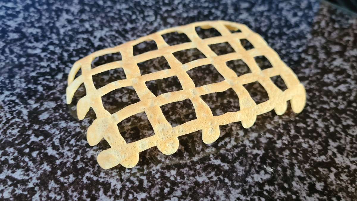 Eine flache beschichtete Pfanne, am besten eine Crepe-Pfanne, ganz leicht mit Butter fetten und kräftig erhitzen. Mit dem Dosierfläschchen Muster mit dünnen Linien wie Gitter, Spiralen und Symbole in die Pfanne zeichnen, die Hitze etwas reduzieren und einseitig ausbacken, bis die Muster zart bräunen. Auf einem Brett oder Küchenpapier auskühlen und weiter trocknen lassen. Nach zwei Stunden biegen sich die Dekostücke etwas auf und sind so trocken, dass sie federleicht und trotzdem recht stabil sind. Dessen ungeachtet vorsichtig mit den Teilen umgehen und sie beim Anrichten zum Schluss auf den Tellern platzieren, auflegen oder aufstellen.