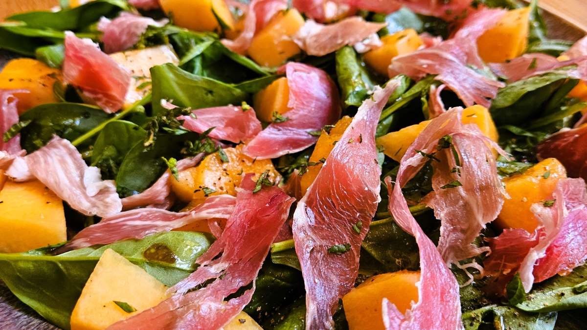 Prosciutto und Melone sind ein Sommerpaar, das wir immer mit Italien verbinden. Aus dieser klassischen Kombination haben wir einen erfrischenden und leichten Salat kreiert, diesmal variiert mit einem feinen spanischen Rohschinken, aber natürlich ist Prosciutto ebenso möglich. Die reifen Zuckermelonen, die jetzt auf dem Markt erhältlich sind, harmonieren bestens mit Spinat und Schinken.