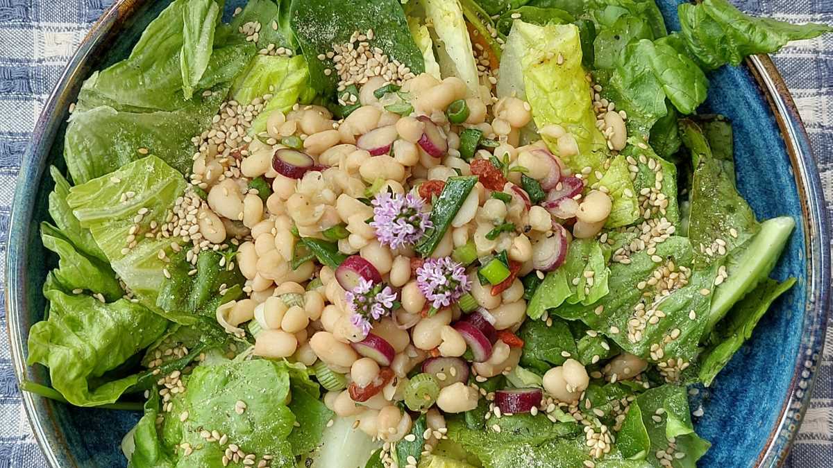 Anfang Mai von einer kurzen Reise zurück beobachteten wir, wie durch satten Regen und nachfolgendem Sonnenschein die Natur explodierte; der alte Kastanienbaum im Hof war mit üppiger weißer Kerzenpracht geschmückt, aber auch auf unserem Kräuterbalkon fanden wir das Bohnenkraut mit zarten hellblauen Blüten vor. Das machte Lust, wieder einen Salat zu kreieren.