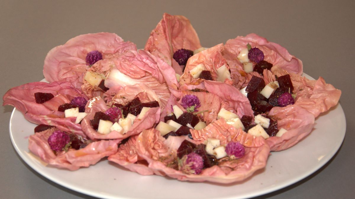 Eine wunderschöne rosafarbene Salatsorte heißt Rosa del Veneto nach der Region, wo sie kultiviert wird. Ihre Saison, in der sie auch in Wien in guten Gemüsegeschäften zu haben ist, reicht vom Winter bis ins Frühjahr. Sie wird übrigens als Pink Radicchio auch in den Vereinigten Staaten angebaut. Es handelt sich also um eine Radicchio-Art mit einer zarten bis kräftig rosa Farbe.