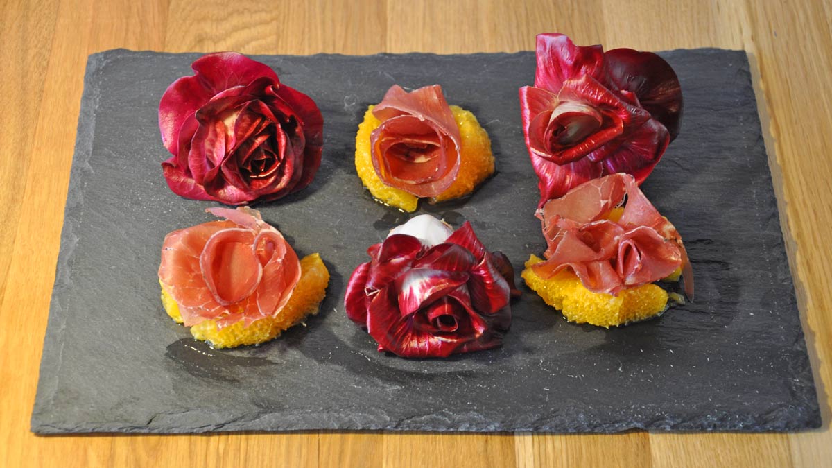 Die wunderbare Rosa di Gorizia spielt immer die Hauptrolle, wenn sie in einer Vorspeise auftaucht. Dieses Rezept ist farblich sehr ansprechend und geschmacklich außergewöhnlich. Das Süß der Orangen verbindet sich hervorragend mit dem zart bitteren Geschmack der Rosen. Luftgetrockneter Rinderschinken bringt noch eine feine Geschmacksnuance ein.