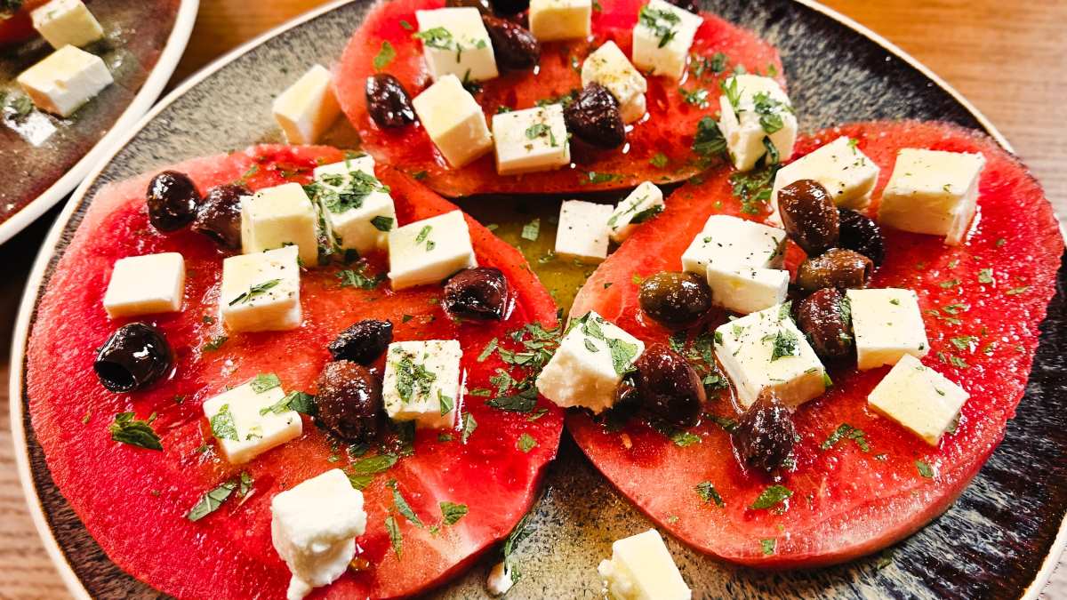 Auf dem Markt gab es spätsommergemäß reife Mini-Wassermelonen aus dem Burgenland, die nur wenige kleine Kerne aufweisen und sehr erfrischend schmecken. Da kam uns die Idee, eine Anrichte-Variante des Salates „Wassermelone mit Feta“ aus unserem Buch „Große Salate“ zu gestalten. Das Dressing ist komplett neu, auch die Kräuter haben wir überarbeitet, aber sonst sind die Zutaten nahezu ident.