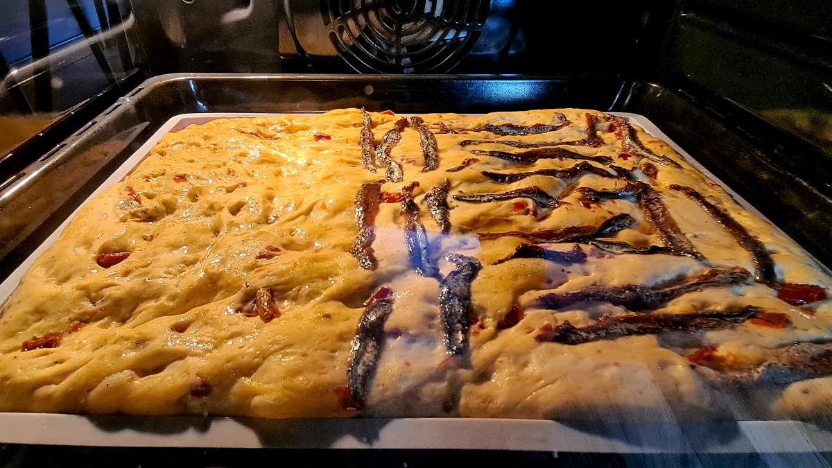 Mit dieser Focaccia haben wir einer geselligen Runde in Muggia Freude gemacht. Ab und zu gibt es in der Nachbarschaft zwanglose Treffen, bei denen die letzten Neuigkeiten ausgetauscht und Projekte besprochen werden. Jeder und jede bringt eine Kleinigkeit zum Trinken oder Essen mit. Wir brachten eine würzige Focaccia mit, die Johannes mit einem neuen Rezept probiert hat.