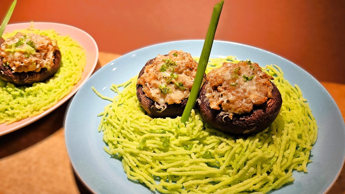 Von der Zubereitung eines feinen Schmorgerichts, dem Boeuf Bourguignon, waren noch große braune Champignons übrig. Da wir einen Gast zum Abendessen erwarteten, überlegten wir, daraus eine kleine Vorspeise zu komponieren. Im Kühlschrank fand sich noch etwas vom italienischen geräucherten Blauschimmelkäse, der sich ideal für dieses Gericht eignete. Sozusagen ein Resteessen der besonderen Art.